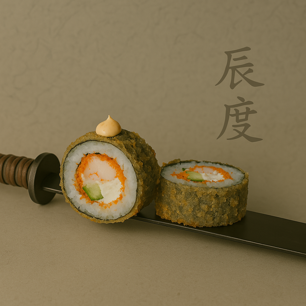 Авторский ролл с начинкой из картофеля-пай, бекона в кляре, болгарского перца, зеленого лука и сливочного сыра. Украшается соусом "Унаги"