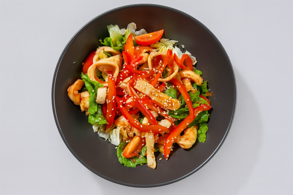 Креветки и кальмар с овощами под пряным креветочным соусом. Согревающий и насыщенный вкус.