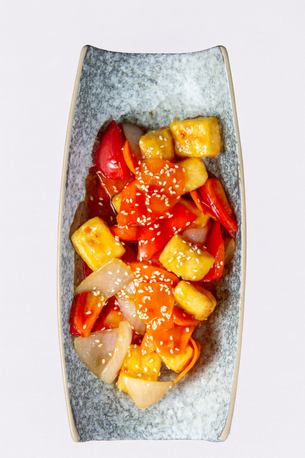 Хрустящий обжаренный тофу с болгарским перцем и морковью под ароматными соусами. Лёгкое и яркое блюдо.