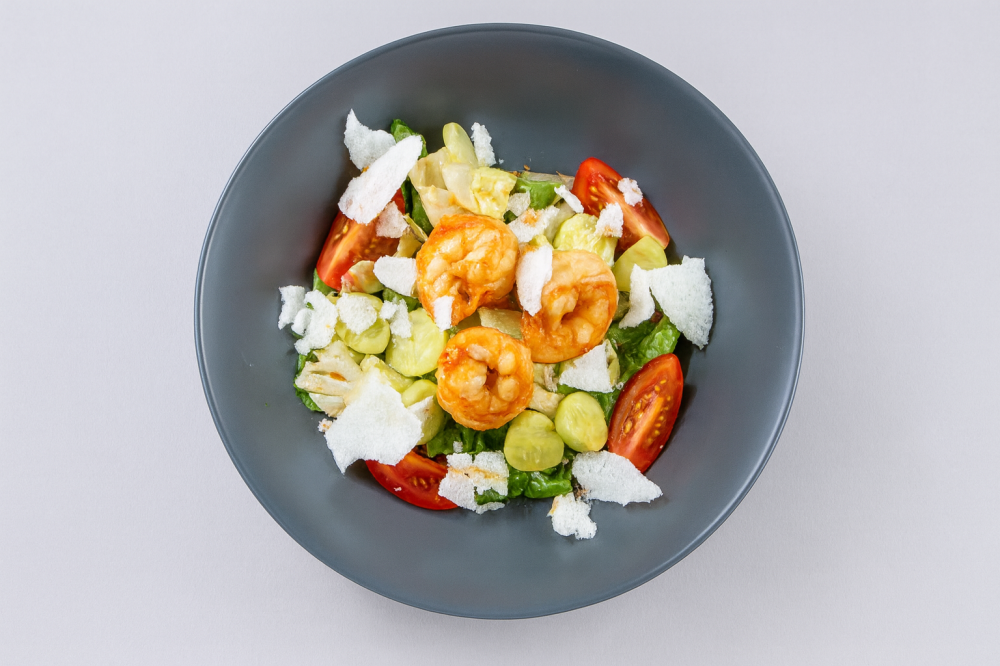 Свежие листья салата и шпинат с креветками и юдзу-соусом. Лёгкость, цитрусовая свежесть и хрустящие акценты.
