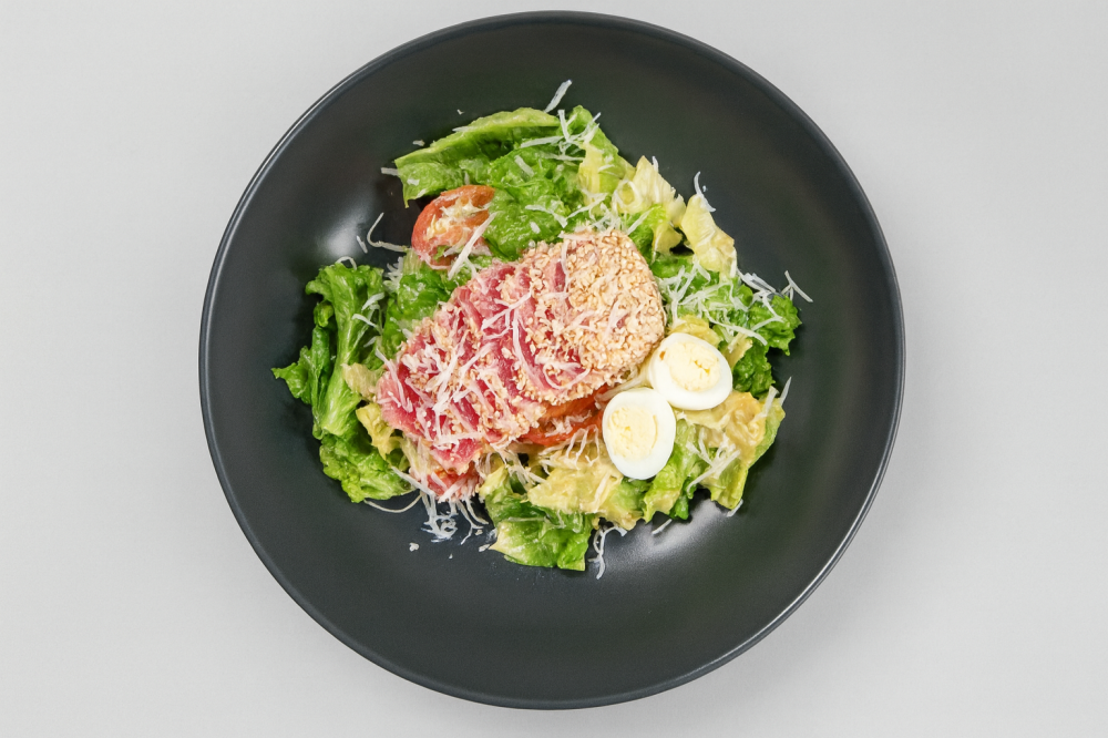 Обжаренный тунец с айсбергом, черри и соусом татакэ. Яркий вкус моря с лёгким ароматом кунжута.