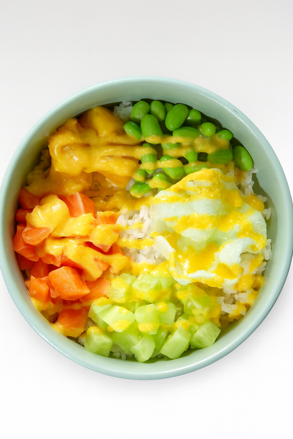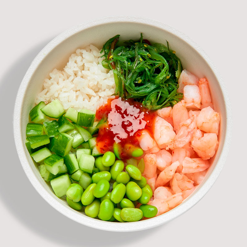 Нежные креветки, Огурец и морские водоросли с ореховым соусом. Сбалансированная классика поке.