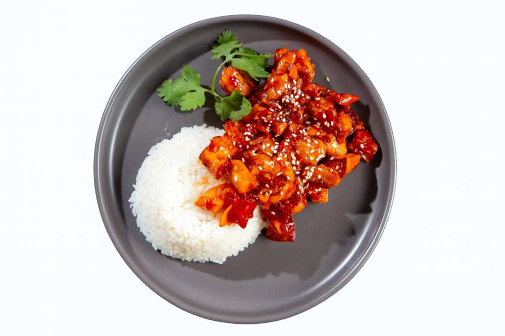 Нежное куриное бедро в сладко-острой глазури терияки и чили. Подаётся с ореховым соусом.