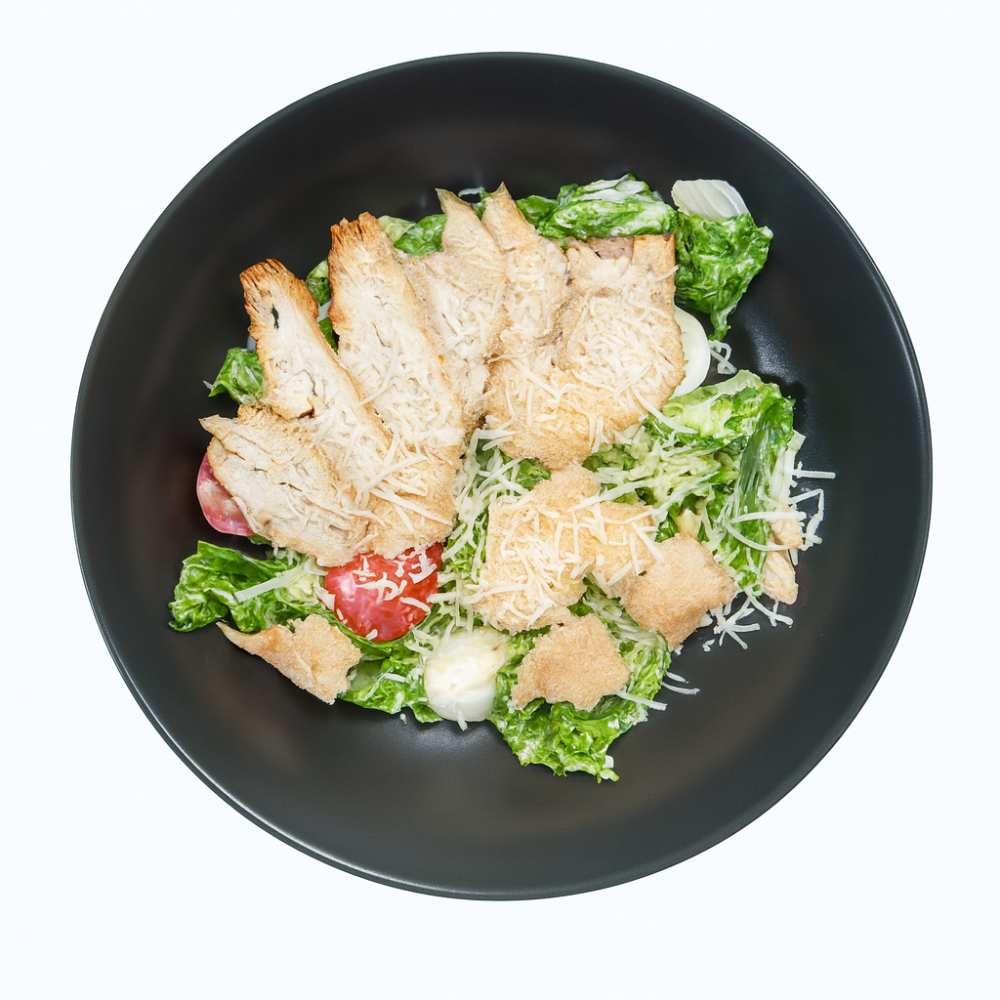 Цезарь в японском стиле: курица, хрустящий айсберг, перепелиное яйцо и пармезан с креветочными чипсами.