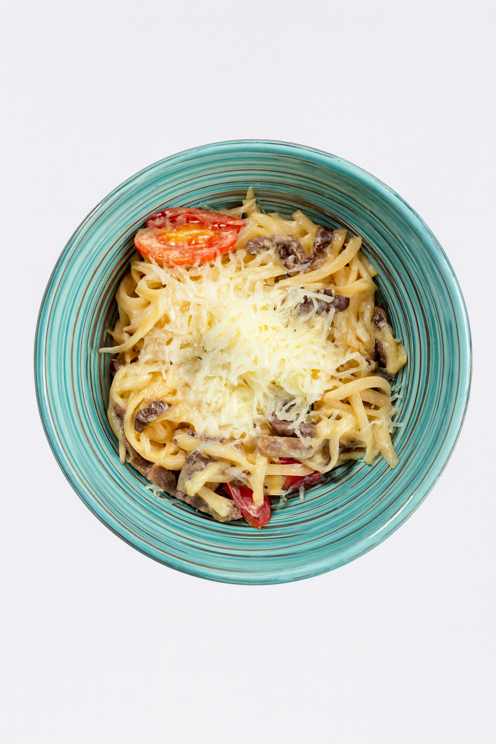 Говядина с черри, сливками и пармезаном, в обволакивающем сливочно-перечном соусе.