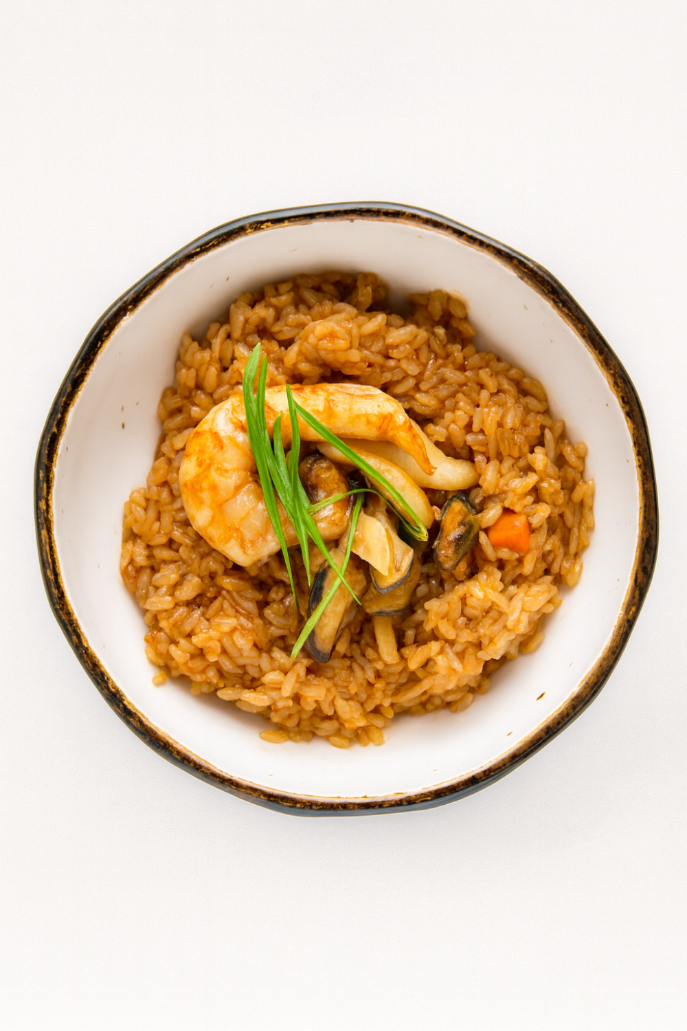 Рис с овощами и соусами кимчи, с креветками, кальмаром и мидиями. Морской акцент в японском стиле.