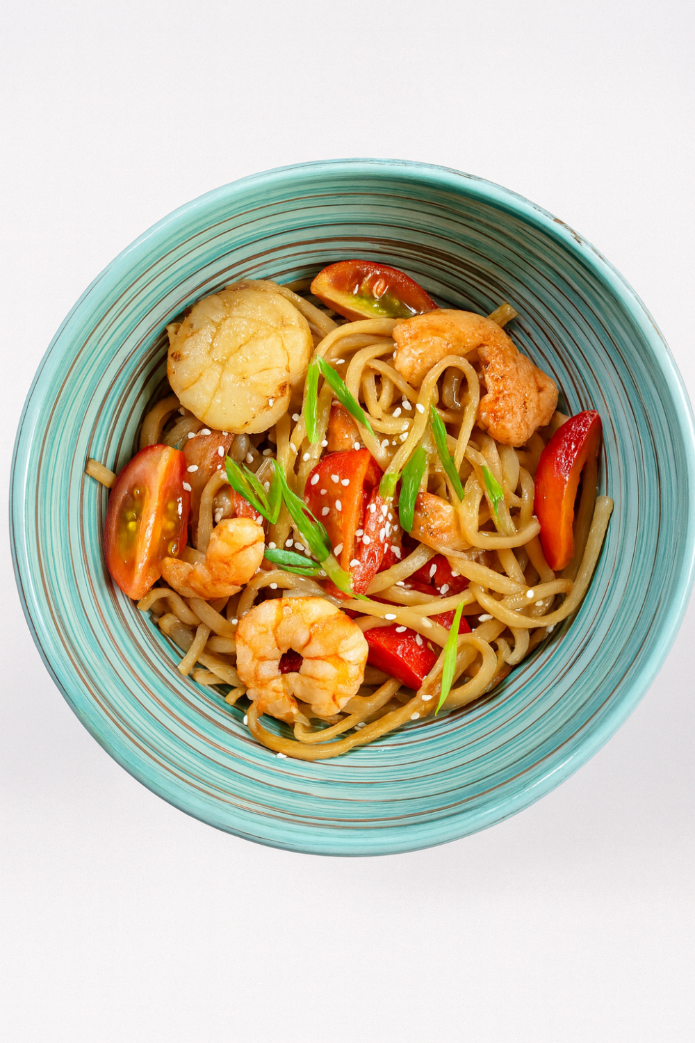 Креветки, кальмар, гребешок и лосось с удоном в соусе унаги. Морской вкус в каждом кусочке.