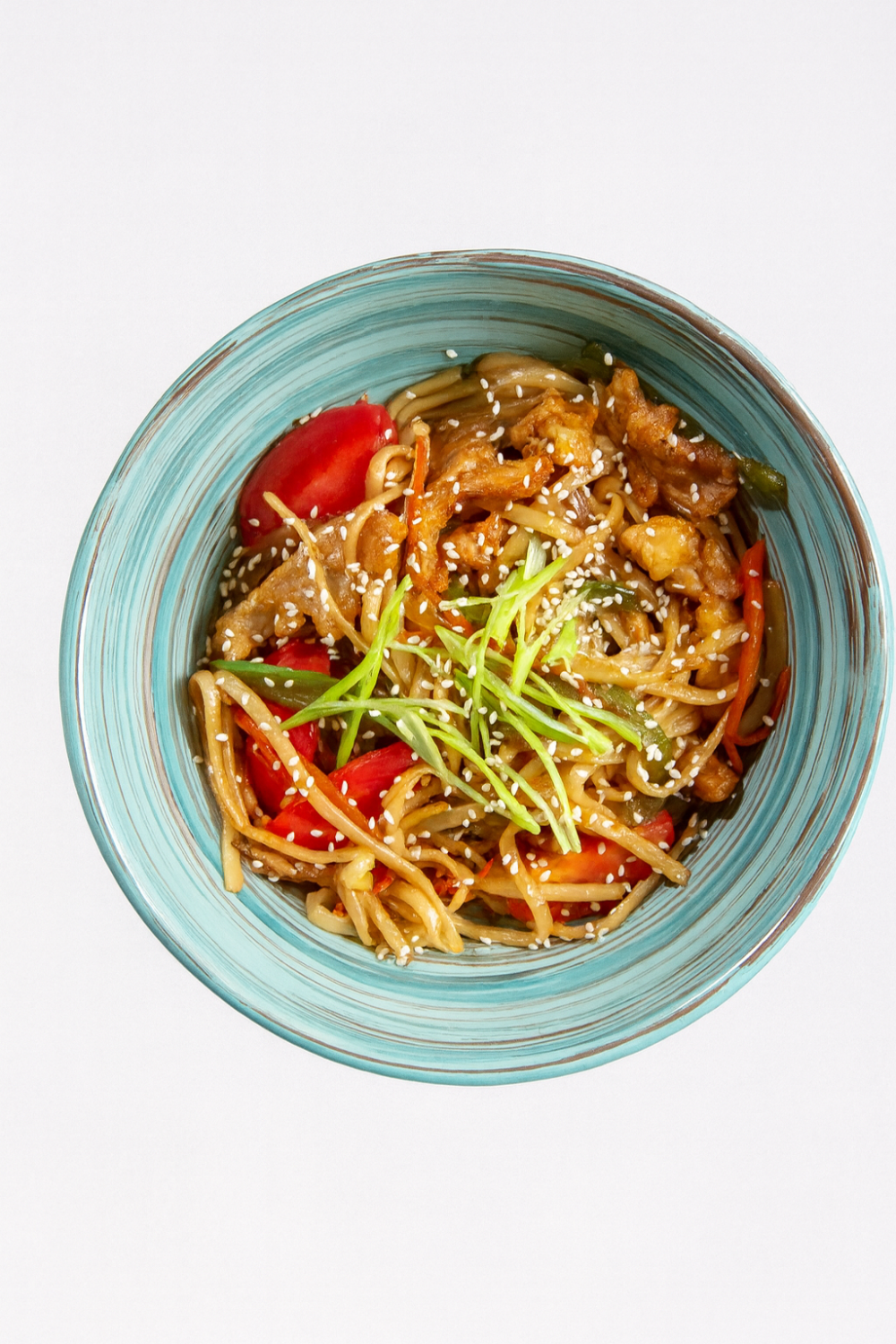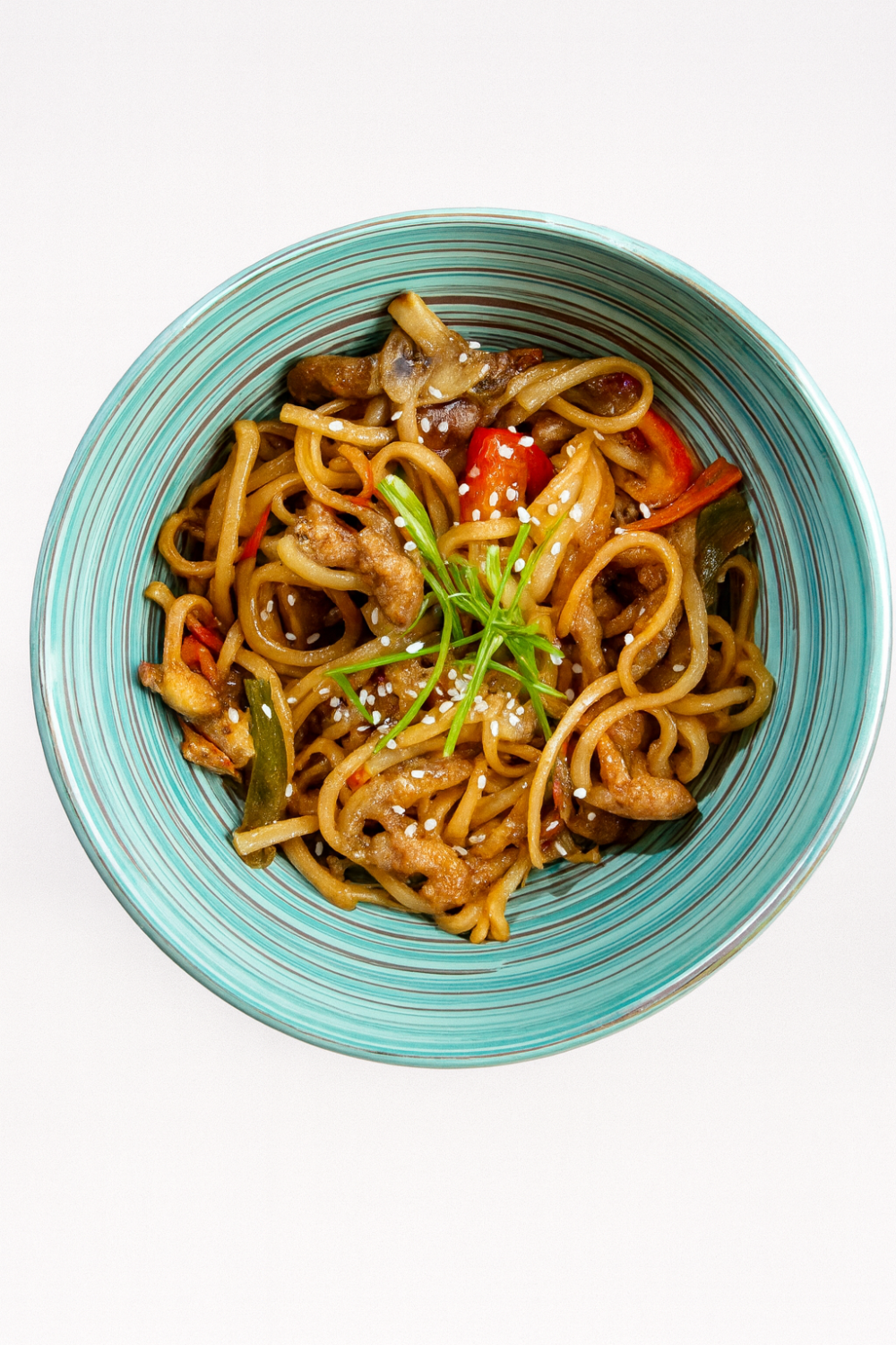 Куриное филе с овощами и лапшой удон в фирменном соусе. Японская классика для сытного ужина.