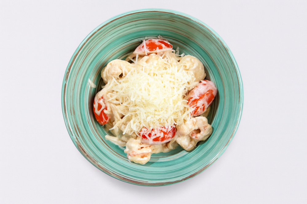 Креветки и лапша удон в нежном сливочном соусе с пармезаном и устричным акцентом.