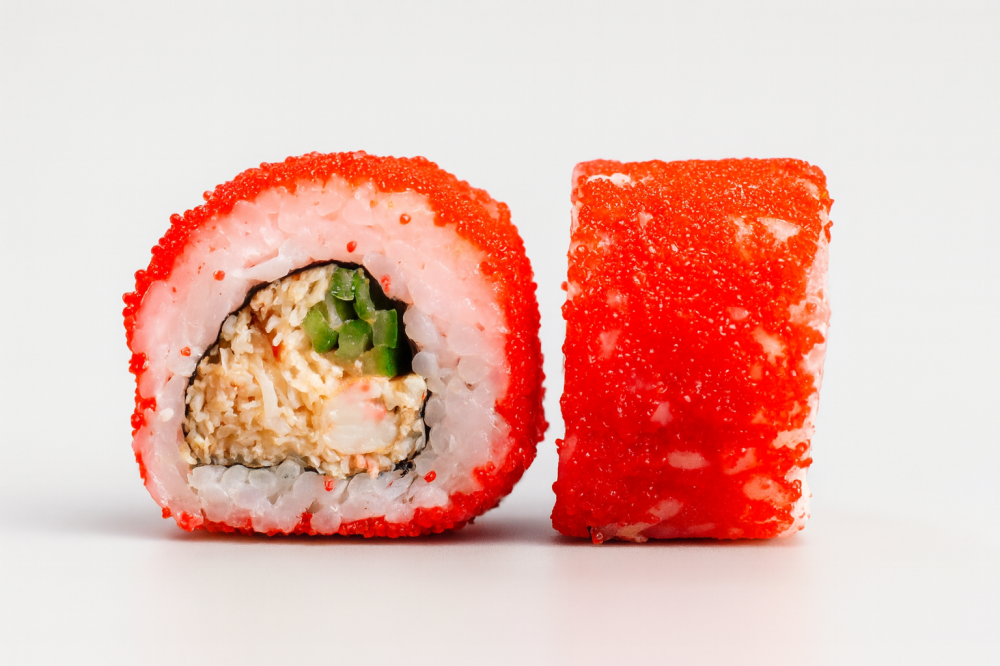 Лосось терияки, крем-сыр и огурец под сладковатой икрой. Чистый вкус и лёгкая сладость терияки — ярко и сбалансированно. 8 шт