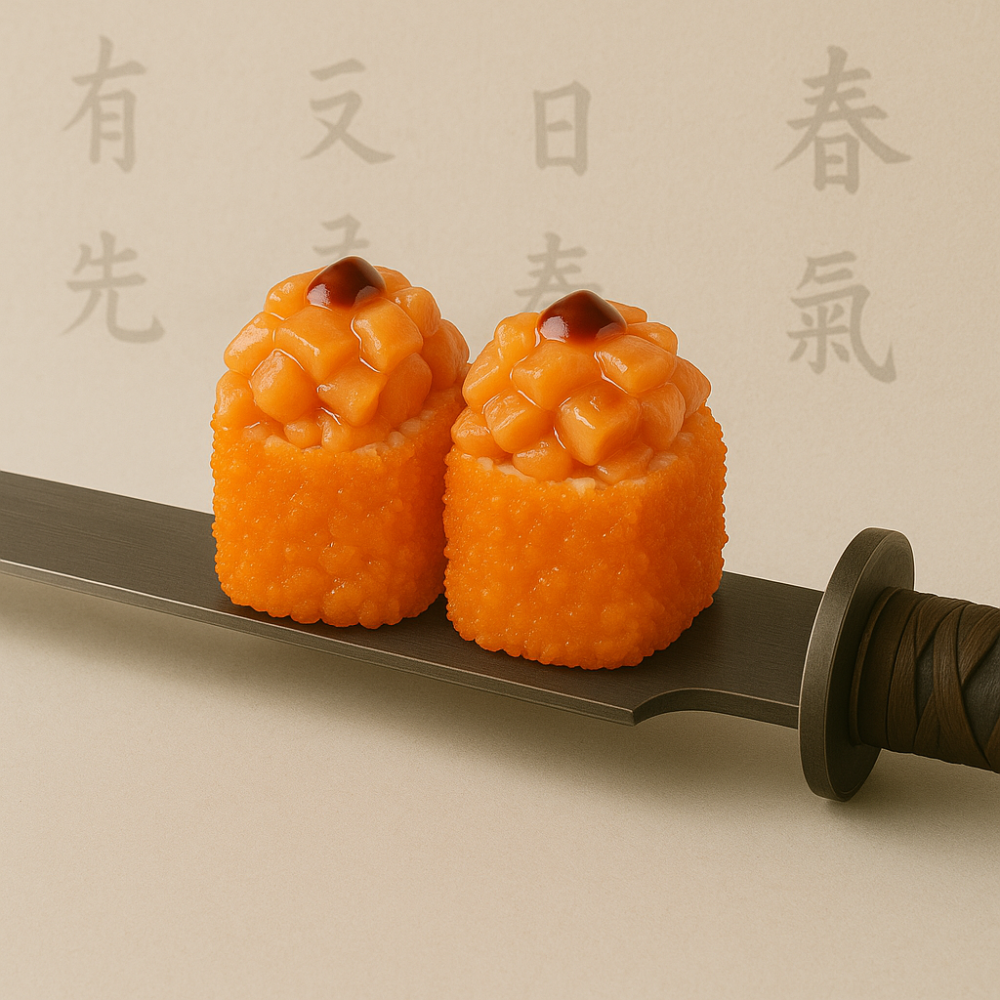 Гребешок и крем-сыр, щепотка масаго и васабико — нежно, с лёгкой сладостью. 8 шт
