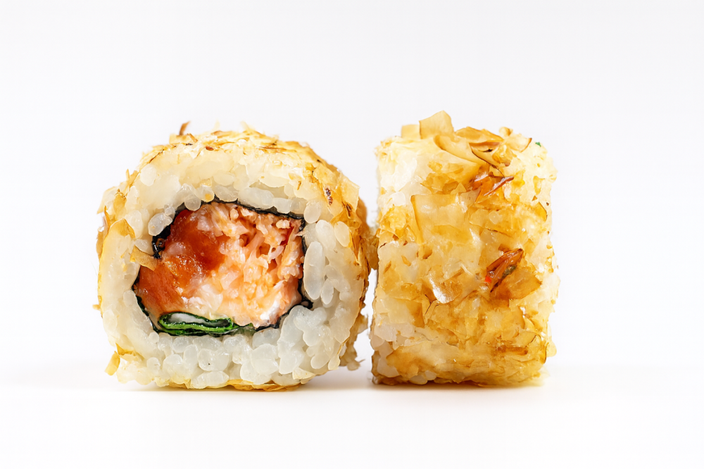 Лёгкий сливочный ролл с дуэтом лосося и краба, акцент зелёного лука и умами-стружки тунца.
