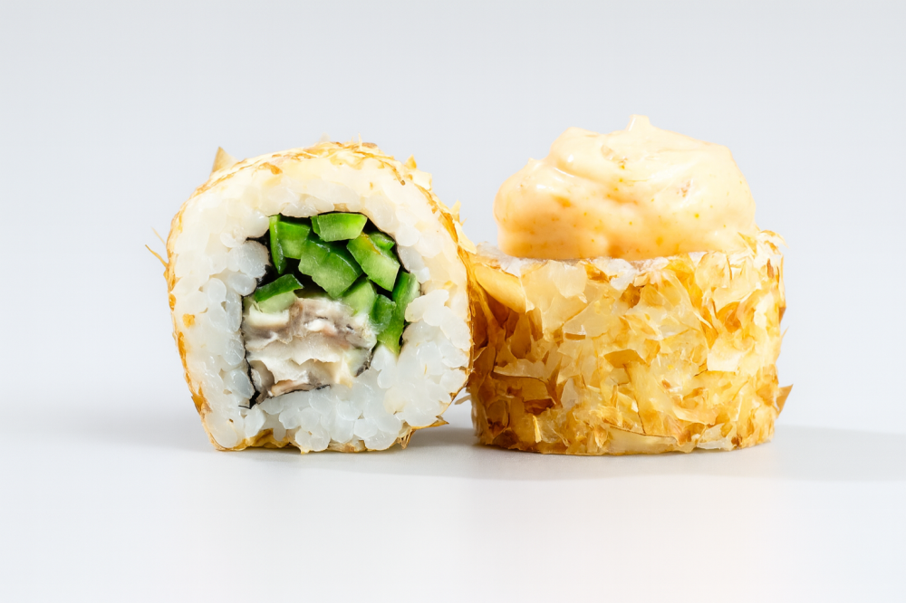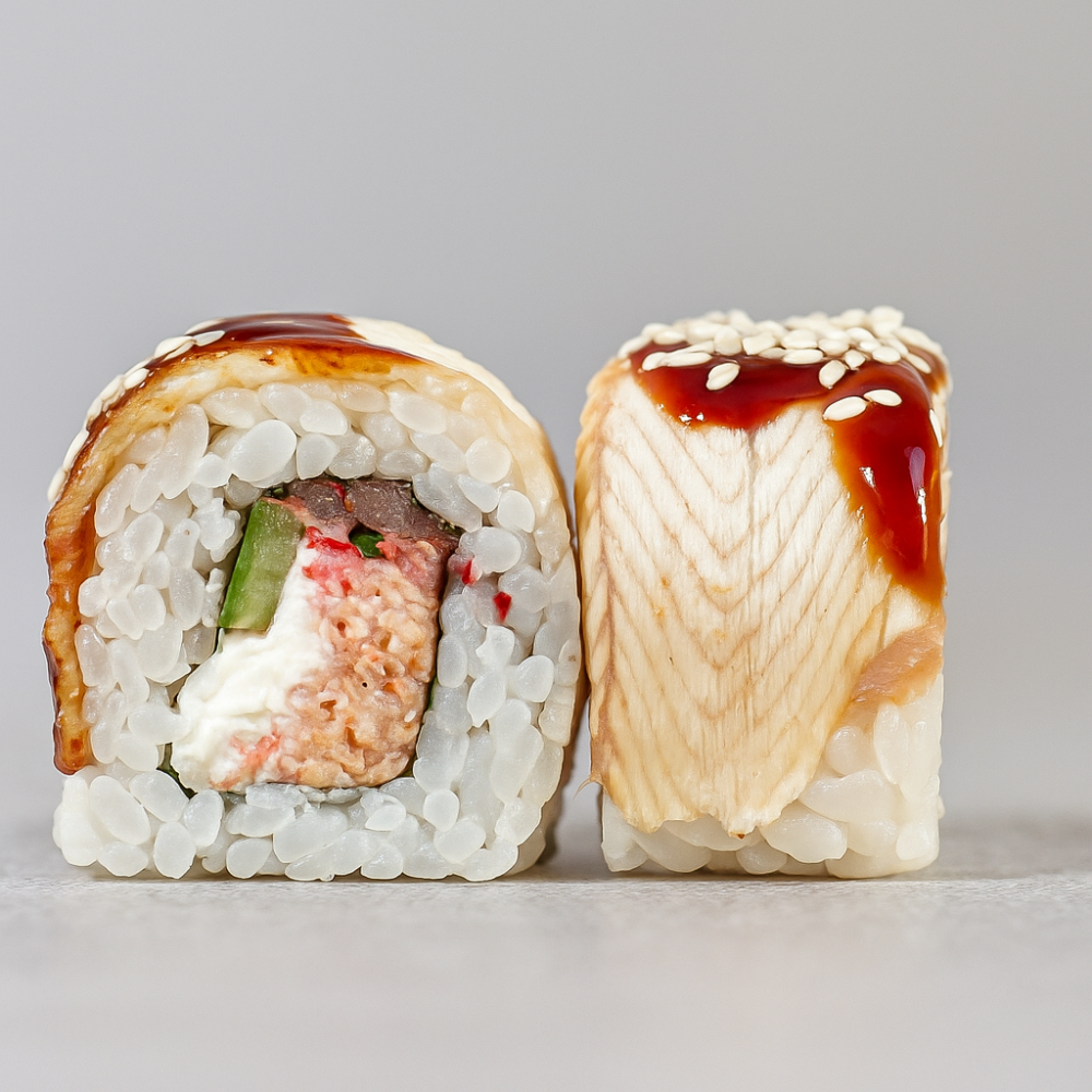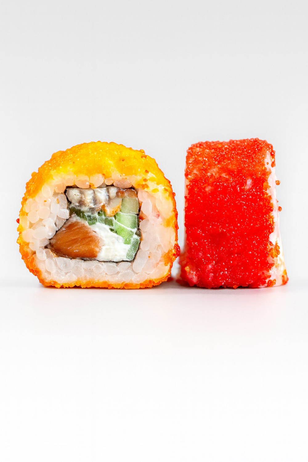 Сливочный ролл с угрём, крабом и огурцом; унаги + кунжут, лёгкий хруст тобико