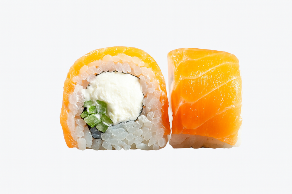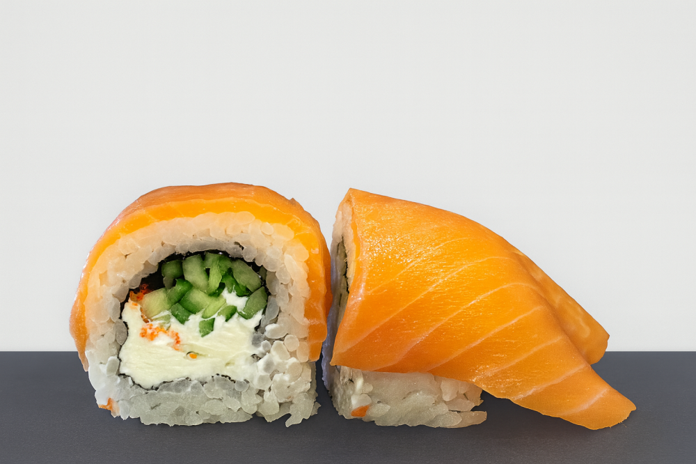 Компактный ролл с крупной порцией лосося и двойным сыром, лёгкий хруст икры и огурца.