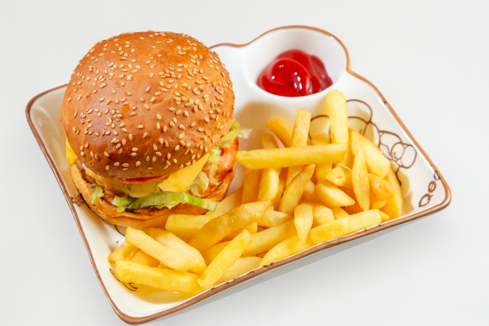 Мягкая булочка, хрустящая куриная котлета во фритюре, расплавленный чеддер, айсберг, томат, корнишоны, соус дуо (кетчуп + майонез). Подаётся с порцией картофеля фри и кетчупом.