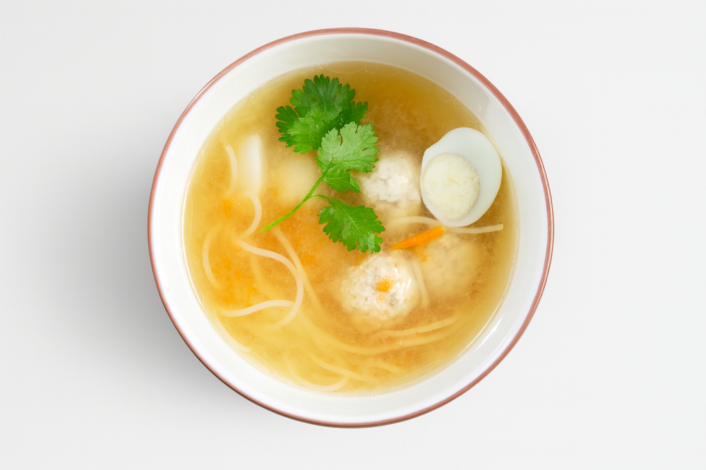 Прозрачный куриный бульон с нежными фрикадельками, тонкой лапшой сомэн, половинкой яйца и сладкой морковью. Тёплый и сытный.