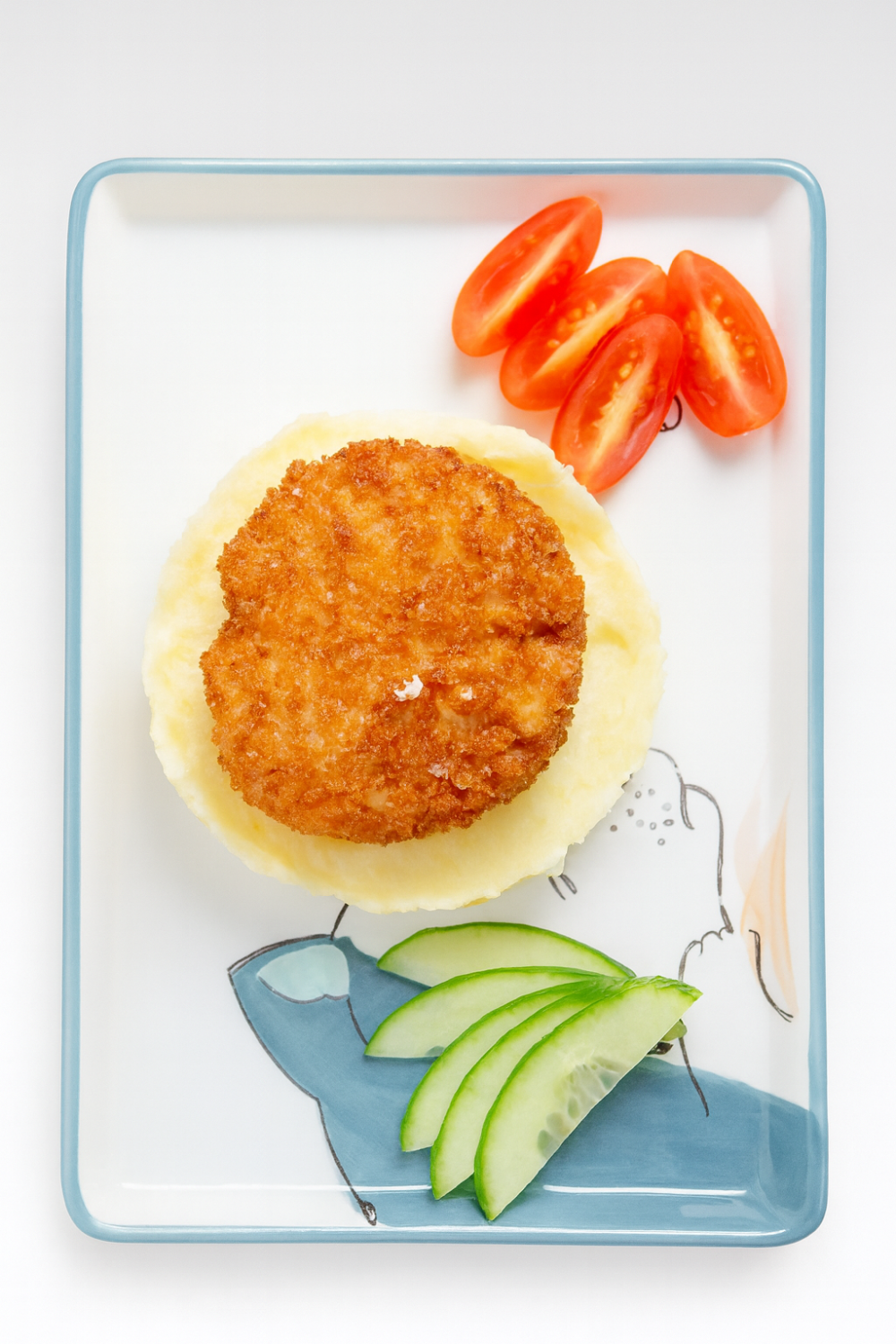 Хрустящая куриная котлета с нежным картофельным пюре и свежими черри — простой вкус, который любят дети и взрослые.